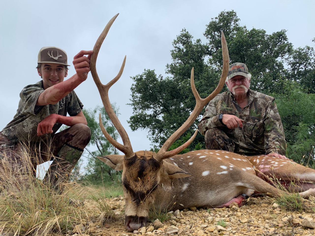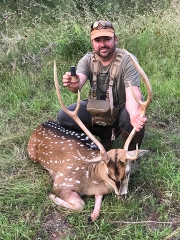 This was my second year hunting with Eric at Joshua Creek for a mature axis buck. We were down to the last evening and we needed something to happen. Eric started screaming with his prototype ezy axis deer call. We immediately got a return scream from an axis buck! He worked a tree line while screaming and breaking branches. Every time Eric screamed at him with his call, this buck would return scream and progressively got more agitated. After multiple exchanges, the buck couldn't take it and finally broke the tree line at 100 yards. He was a huge 7.5 year old buck! I made a good shot even after having my nerves worn to a frazzle with Eric and the bucking exchanging screams. It's one of my best hunts ever and an amazing time. - Paul Prasarn
