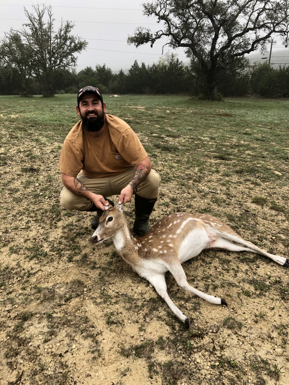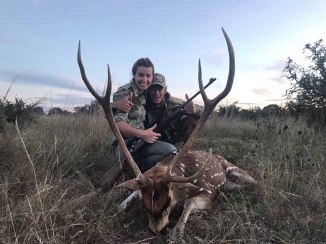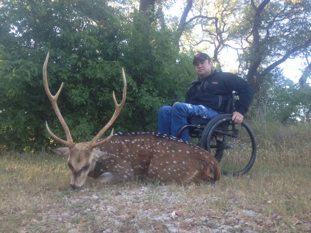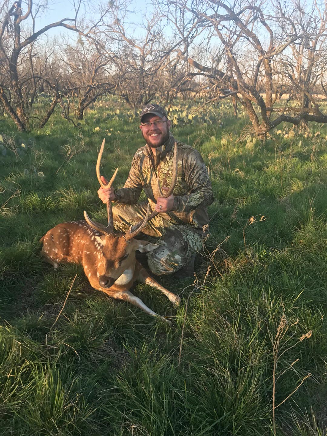 We drove around. at the opposite side of the ranch, near a creek bottom, we spotted a herd of axis. The wind was right and we were able to get within 150yds with some cover from a tree line. I started calling with a mix of ezy axis and the doe call and in minutes two bucks were coming our way. At 104 yds Nelson made a steady perfect kill shot at a nice 31” axis buck. - Luis Zumaeta