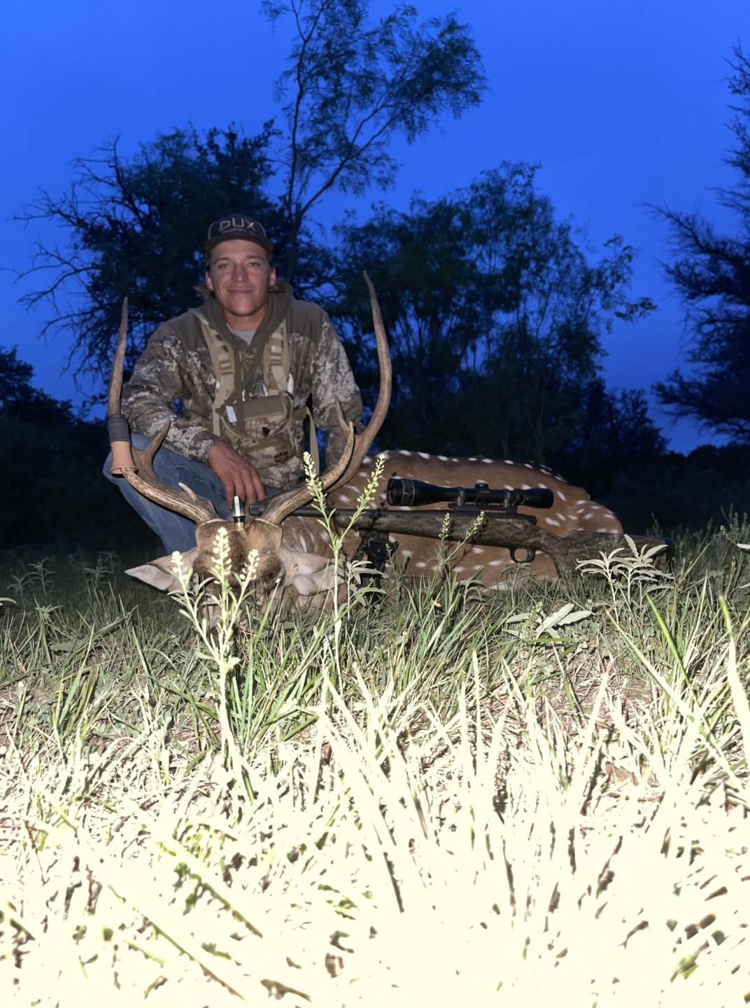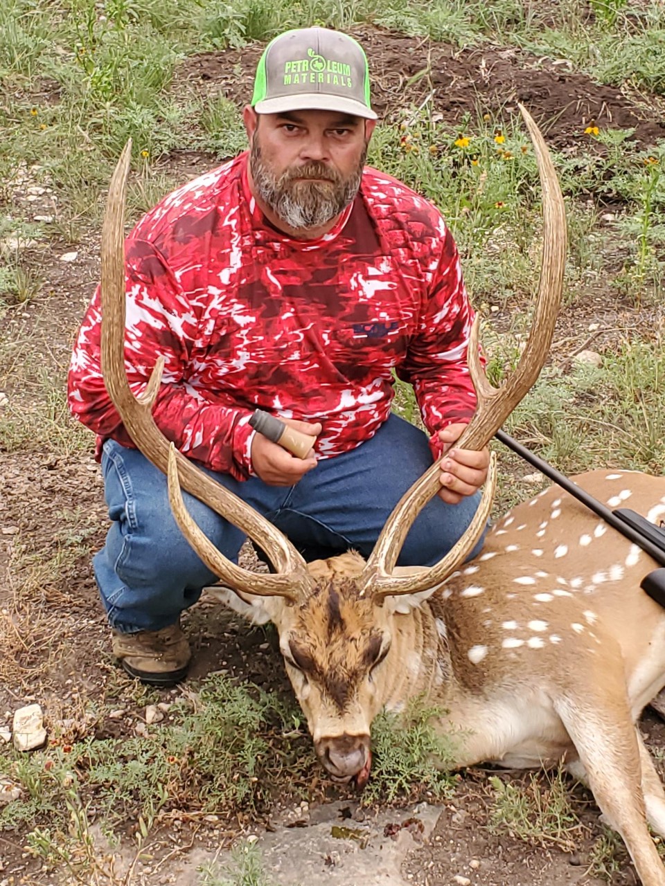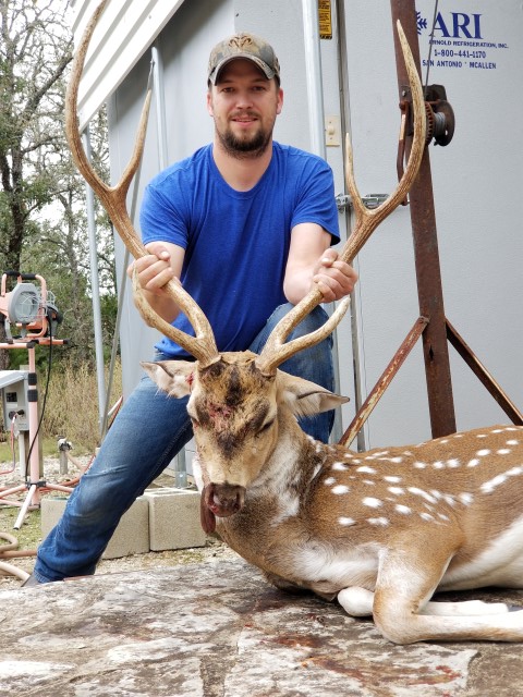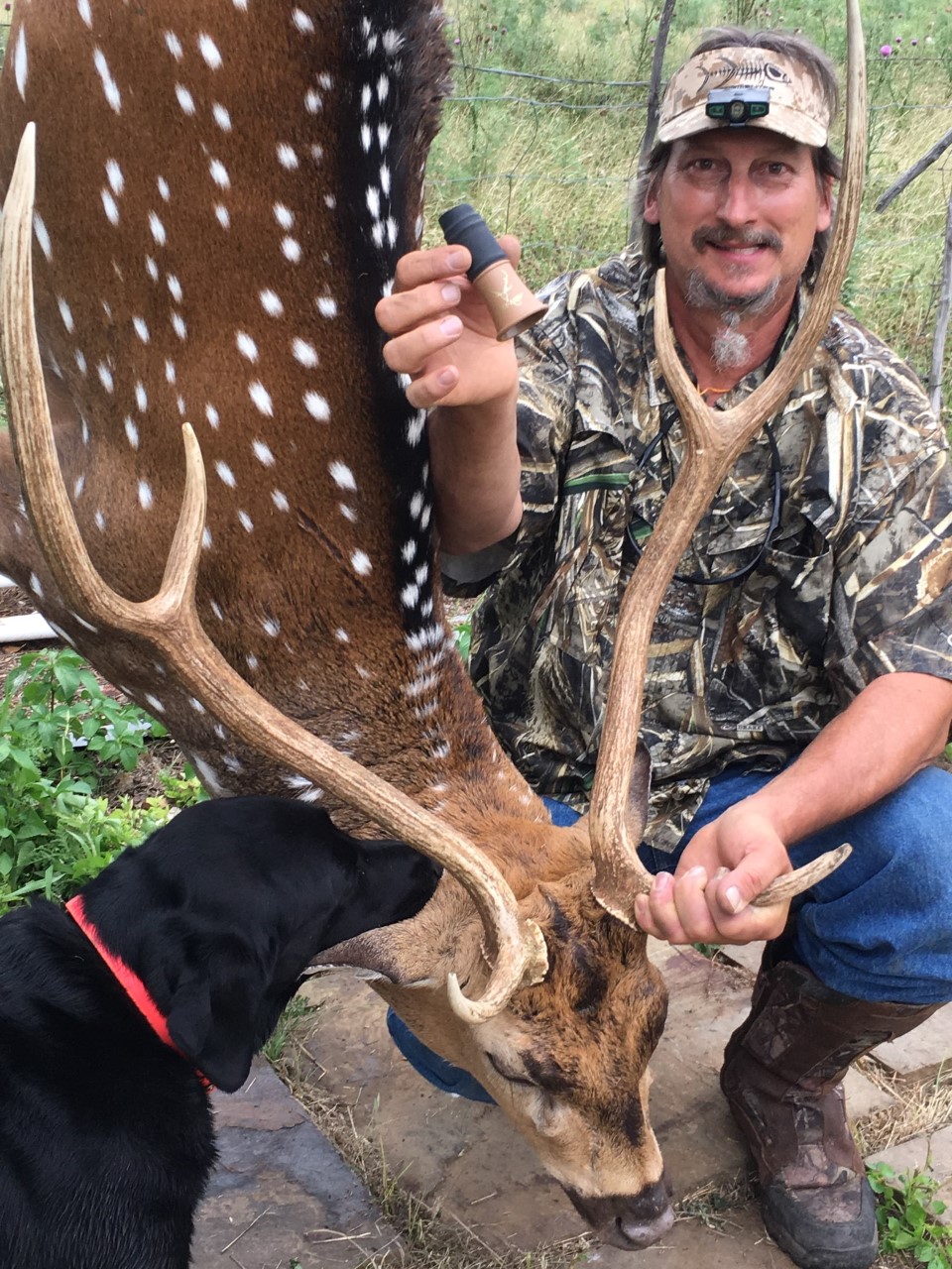 Went to Bennett Oak Creek ranch near San Angelo for a company retreat type deal. We were at camp and waiting to the shadows to get longer and we had been hearing some axis bucks screaming in the brush. The ranch owner said he’d been seeing more bucks than usual and even heard some fight the evening before. So we sat at the blind on the first evening and had seen some whitetails but no axis. I read on the package that the younger bucks call 3-5 times and the older ones 1-3. So I went with 3 times to split the difference. Called and waited for a few minutes and this guy stepped out of the brush looking around. But I was ready and was able to drop him with my 7 mag. Great deer and a great hunt. I have learned to love axis over the past few years and this was my first experience calling one in. - PJoe Don Baker